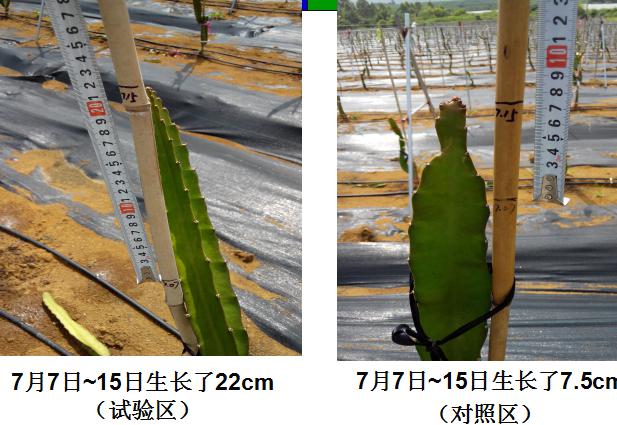 2、施用蝦肽酸性土壤調(diào)理液+根苗壯后,試驗(yàn)區(qū)的火龍果的根部比對(duì)照區(qū)生長(zhǎng)得更長(zhǎng)、更粗壯,莖條比對(duì)照區(qū)生長(zhǎng)更快(一個(gè)星期平均多長(zhǎng)5cm左右)。原來(lái)停止生長(zhǎng)的火龍果也開(kāi)始生長(zhǎng)伸長(zhǎng)。
