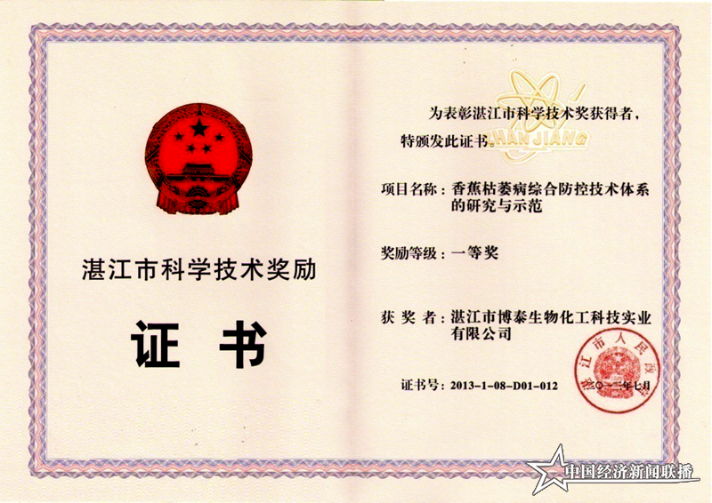 博泰公司通過多次試驗,采用抗病品種+施用蝦肽肥+栽培技術綜合治理措施,使素有“植物癌癥”之稱的香蕉枯萎病發(fā)病率在控制在4%以下,使香蕉枯萎病疫區(qū)的香蕉獲得意想不到的大豐收。由于該綜合防控技術系統(tǒng)的研究及推廣對我國香蕉枯萎病的防治意義重大,經(jīng)濟效益和社會效益顯著,于2013年香蕉枯萎病綜合防控技術體系的研究與示范獲得湛江市科學技術一等獎(如下圖)。