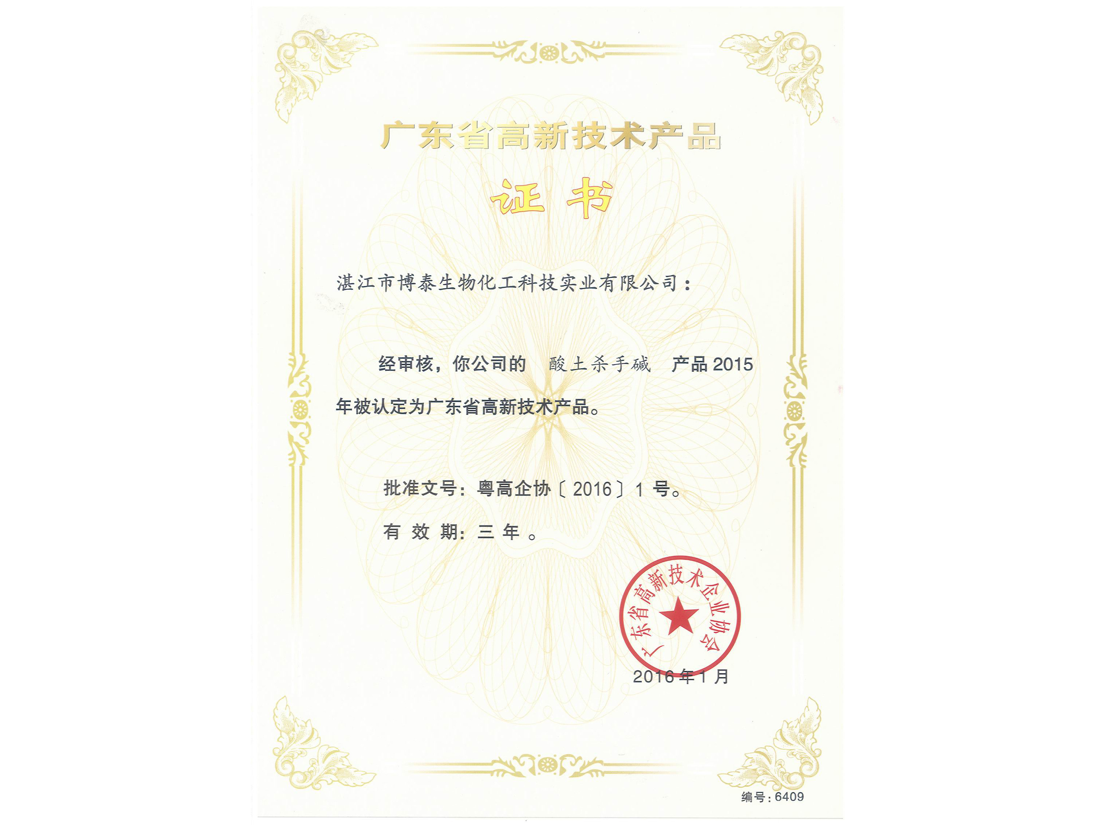 2016年伊始,我司便取得了開門紅,先后獲得由廣東省高新技術(shù)企業(yè)協(xié)會頒發(fā)的兩個(gè)“廣東省高新技術(shù)產(chǎn)品”證書——“酸土殺手堿”和“蝦肽蝦紅素”。